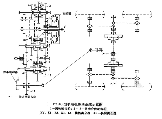 徐工PY180型平地機(jī)的傳動(dòng)系統(tǒng)采用發(fā)動(dòng)機(jī)、液壓變矩器、動(dòng)力換擋變速器的傳動(dòng)形式。他的傳動(dòng)原理簡(jiǎn)圖如下。