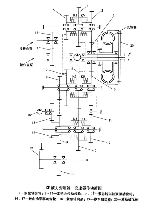 發(fā)動(dòng)機(jī)輸出的動(dòng)力經(jīng)液力變矩器,進(jìn)入動(dòng)力換擋變速器,由變速器輸出軸輸出,經(jīng)萬(wàn)向節(jié)和傳動(dòng)軸輸入三段型驅(qū)動(dòng)橋的中央傳動(dòng)。中央傳動(dòng)設(shè)有自動(dòng)閉鎖差速器,左右半軸分別與左右行星減速裝置的太陽(yáng)輪相連,動(dòng)力由齒圈輸出,然后輸出左右平衡箱輪邊減速裝置,通過(guò)重型滾子鏈輪減速增扭,再經(jīng)車(chē)軸輸出到左右驅(qū)動(dòng)輪。 徐工PY180型自行式平地機(jī)采用ZF液壓變矩器,變矩器或采用Clark液力變矩器-變速器,與發(fā)動(dòng)機(jī)共同工作。液力變矩器與動(dòng)力換擋變速器共殼體,前端與發(fā)動(dòng)機(jī)飛輪殼體用螺栓連接。主、幅變速器相串聯(lián)組曾。前者采用高、低擋幅變速器,具有6個(gè)前進(jìn)擋和3個(gè)倒退擋;后者采用倒、順擋副變速器,設(shè)有6個(gè)前進(jìn)擋和6個(gè)倒退擋;兩者的換擋控制原理相同,下圖為ZF液力變矩器的傳動(dòng)簡(jiǎn)圖。